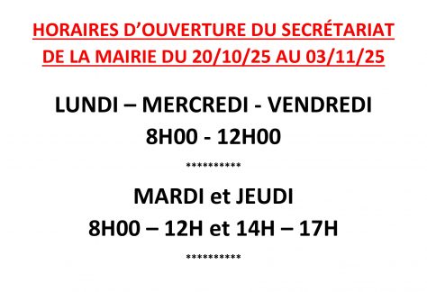 HORAIRES DU SECRETARIAT DE LA MAIRIE DU 20/10 AU 03/11