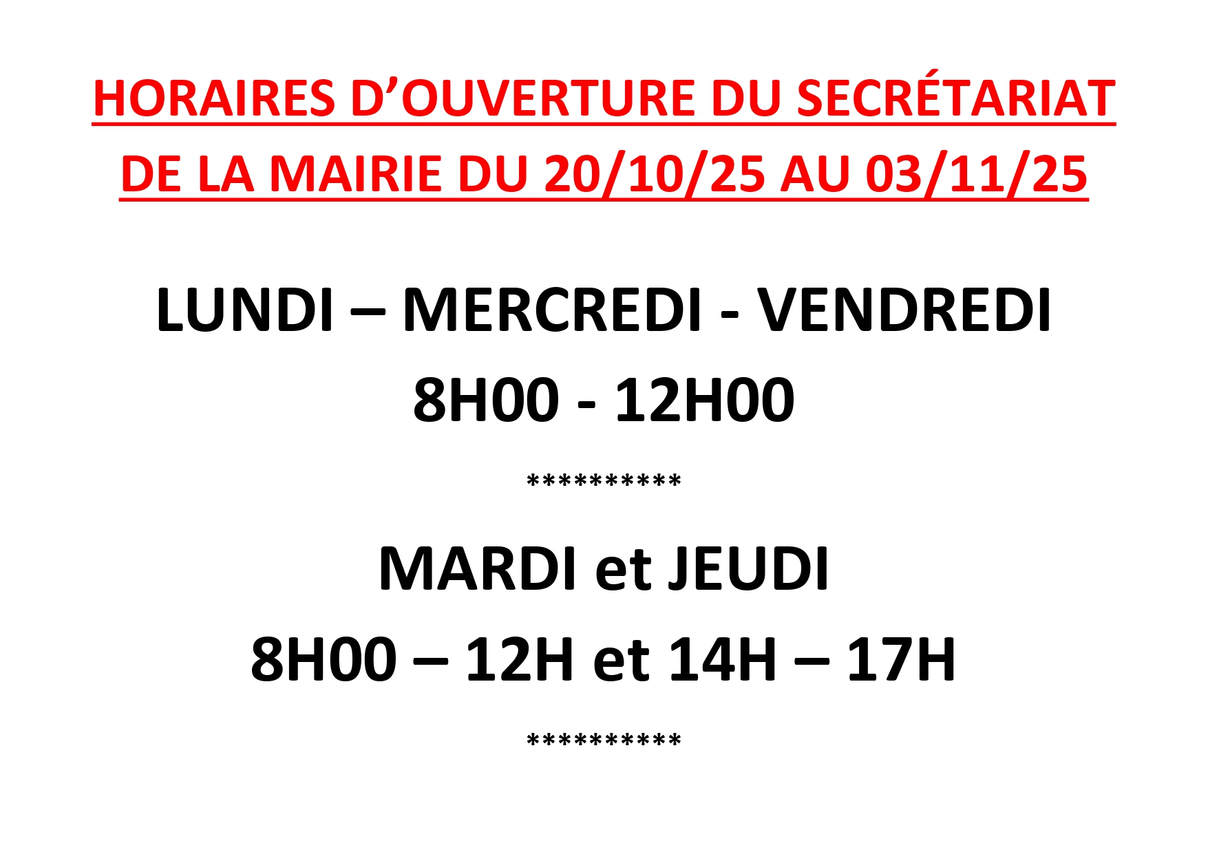 HORAIRES DU SECRETARIAT DE LA MAIRIE DU 20/10 AU 03/11 VOIR L’AFFICHE + Ajouter à mon Agenda Google + iCal / Outlook export 00 jours 00 heures 00 minutes 00 secondes Date Oct 20 2025 - Nov 03 2025 Partagez cet événement