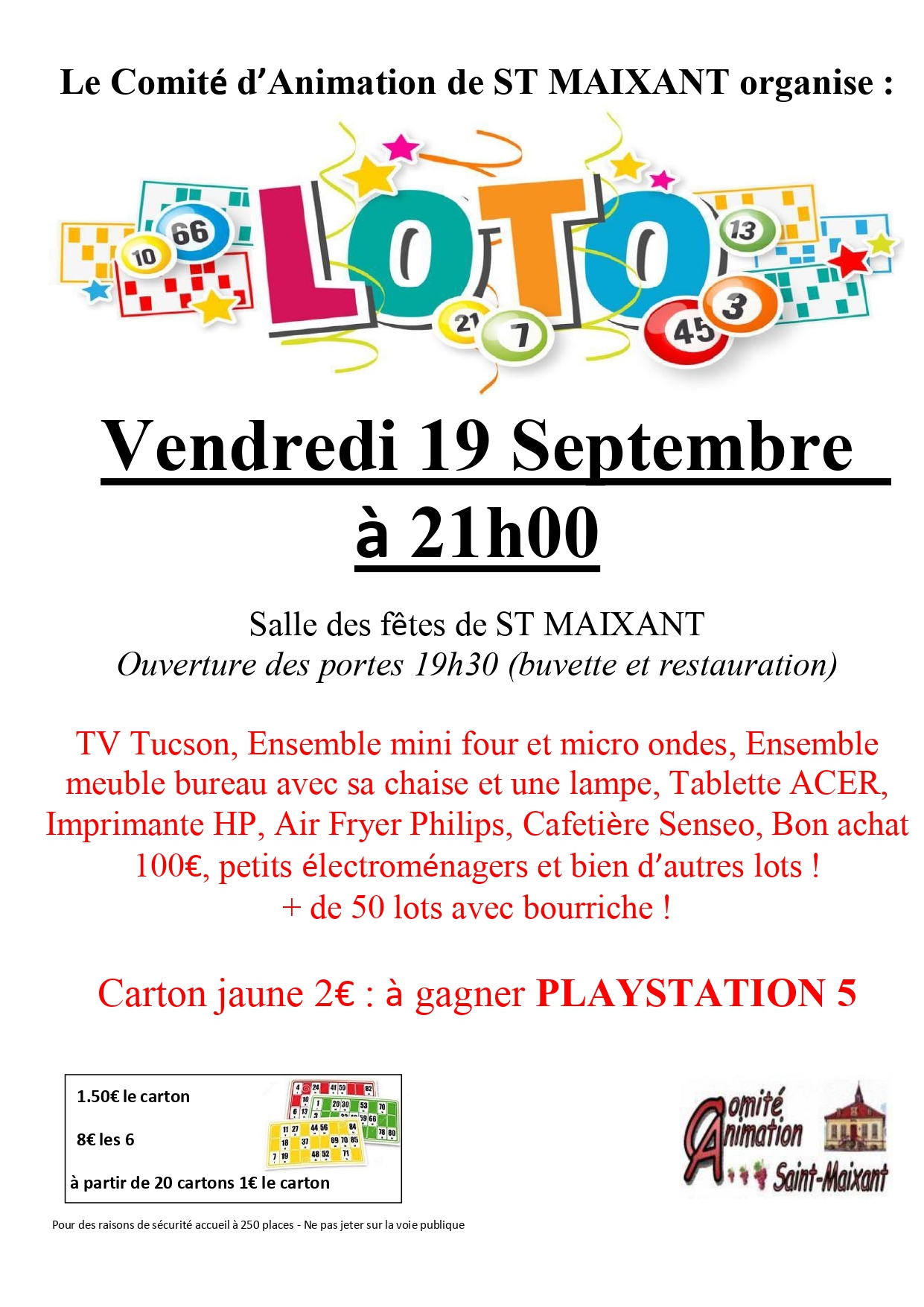 LOTO DU COMITE D’ANIMATION VOIR L’AFFICHE + Ajouter à mon Agenda Google + iCal / Outlook export Date Sep 19 2025 Expiré! Partagez cet événement